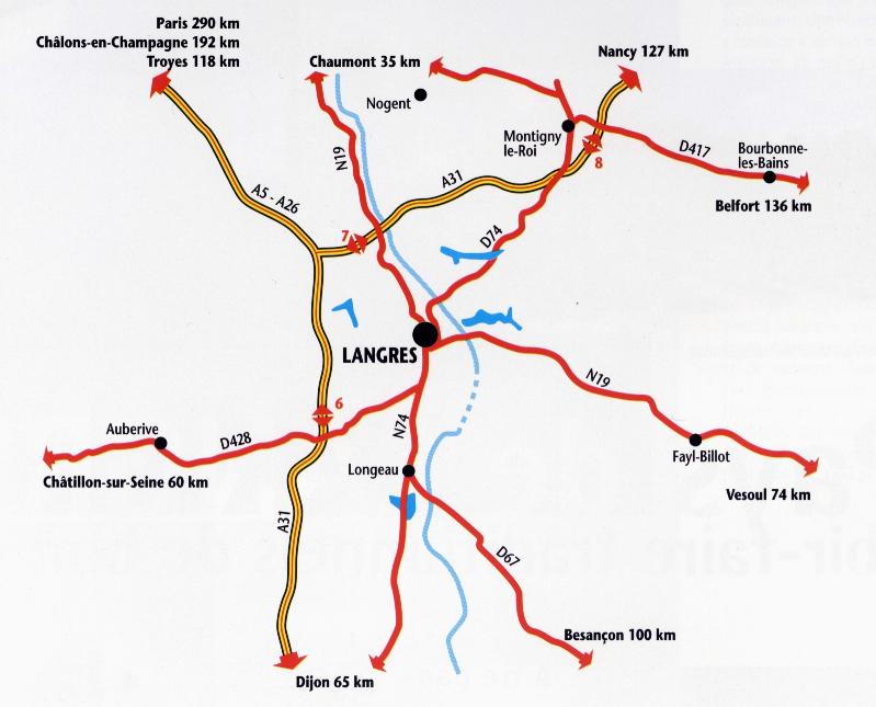La ville de Langres est desservie par des lignes directes depuis Paris Troyes Reims Saint Dizier Vesoul, Pour les villes du sud, un changement de train est à prévoir en gare de Culmont Chalindrey. Le Pass Etudes permet de voyager avec une réduction Venir en voiture Langres se trouve au centre du nœud autoroutier qui place la ville à une heure d’autoroute de Troyes, de Dijon, de Vesoul et à une heure trente de Nancy et Besançon. |